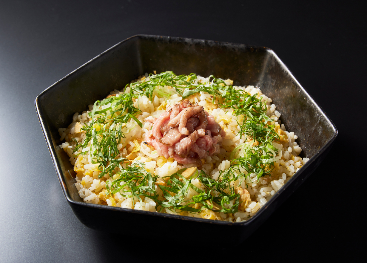 焦がし醤油で炒めたチャーハンに、しそとガーリックをのせています。そのまま食べるもよし。混ぜて食べるもよし。